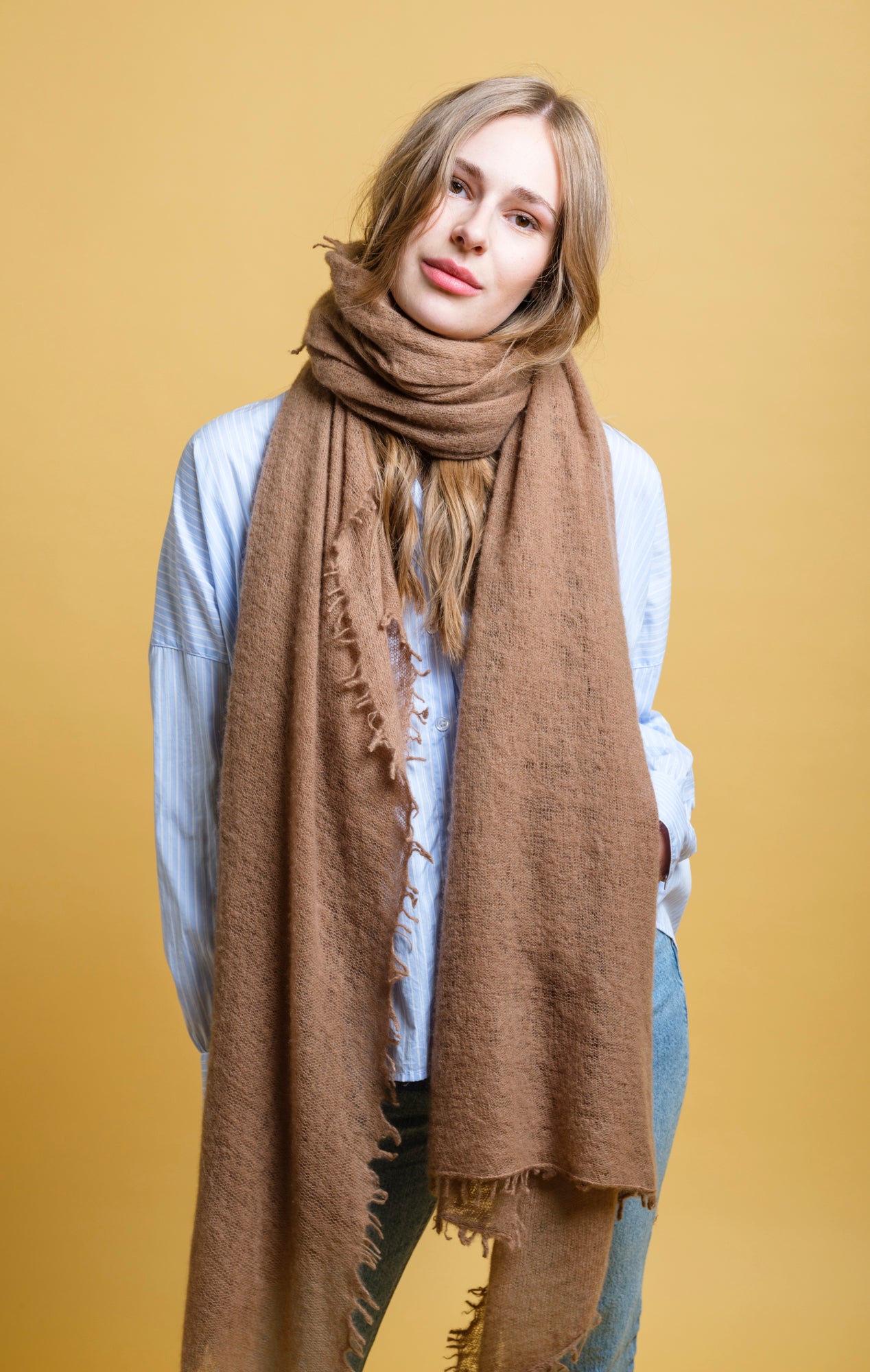 Ein Hauch Liebe: Dieser handgewebte Schal aus federleichtem, oekozertifiziertem Kaschmirgarn wärmt, ohne zu beschweren, und schmeichelt durch seine sehr weiche, luftige Textur. Mit feinen Fransen an den Enden für das gewisse Etwas. Ein zeitloses Allroundtalent.
